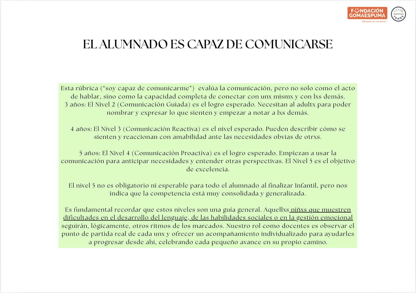 En una etapa tan crucial como la infancia, el desarrollo socioemocional es la base sobre la que se construyen todos los aprendizajes académicos, asi como la autoestima, la empatía, la resiliencia y la capacidad de convivir. Aprender a reconocer y regular las emociones, colaborar con otros, resolver conflictos de forma pacífica y cuidar del entorno son aprendizajes esenciales que esta rúbrica permite observar y potenciar de manera estructurada y sistematizada.
